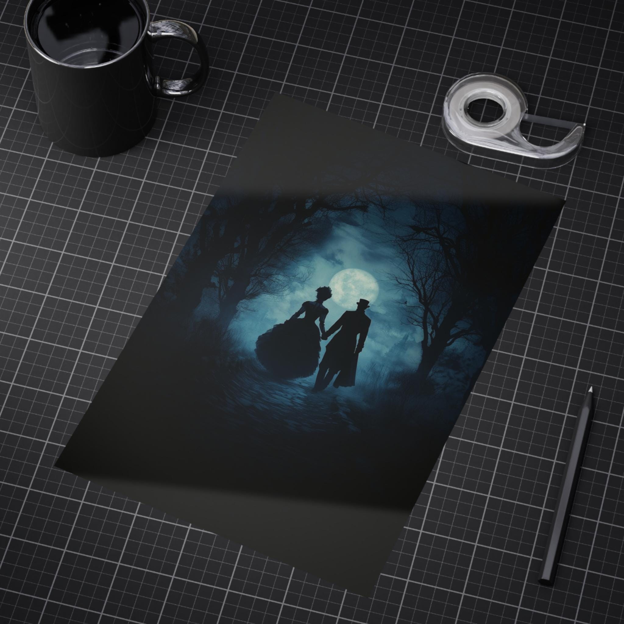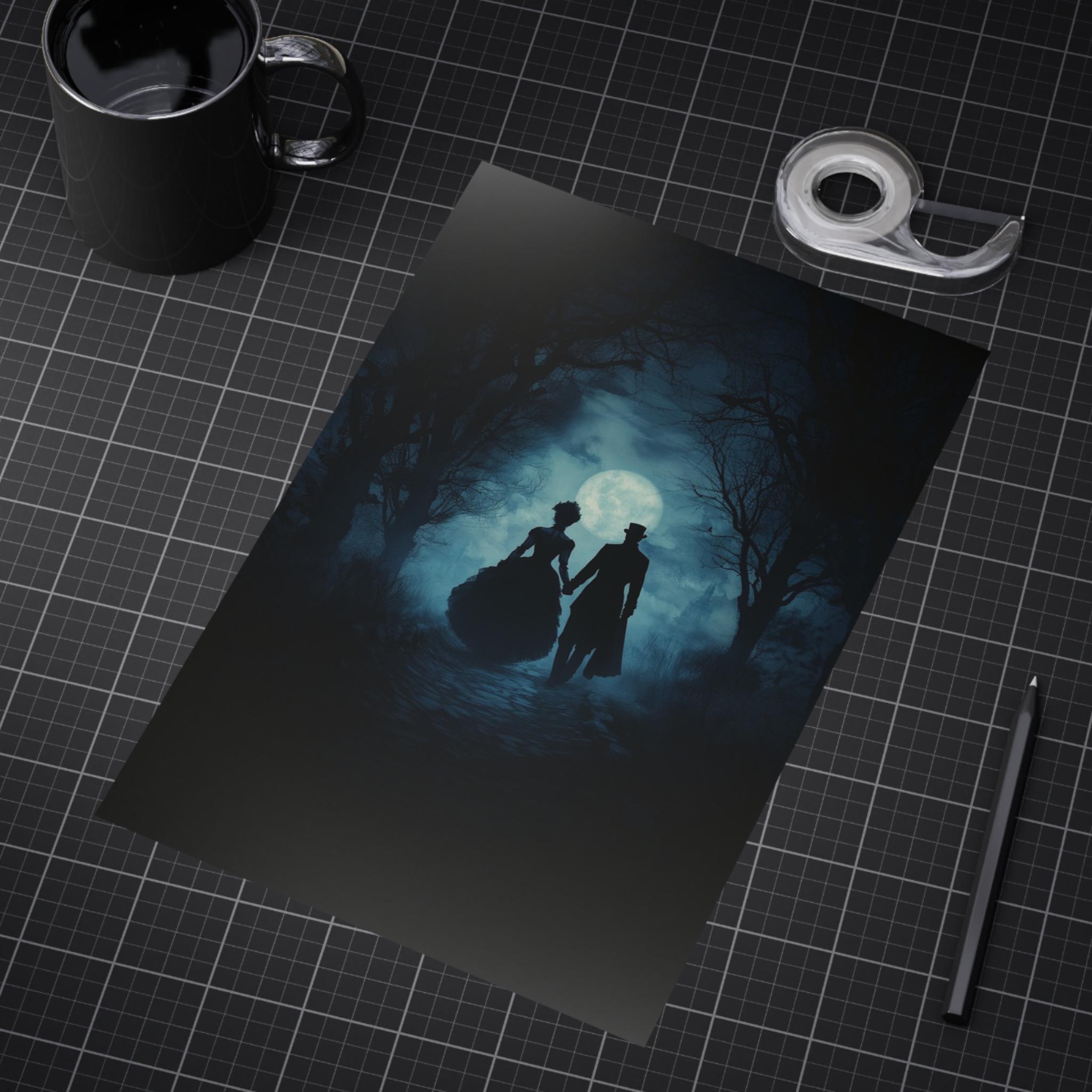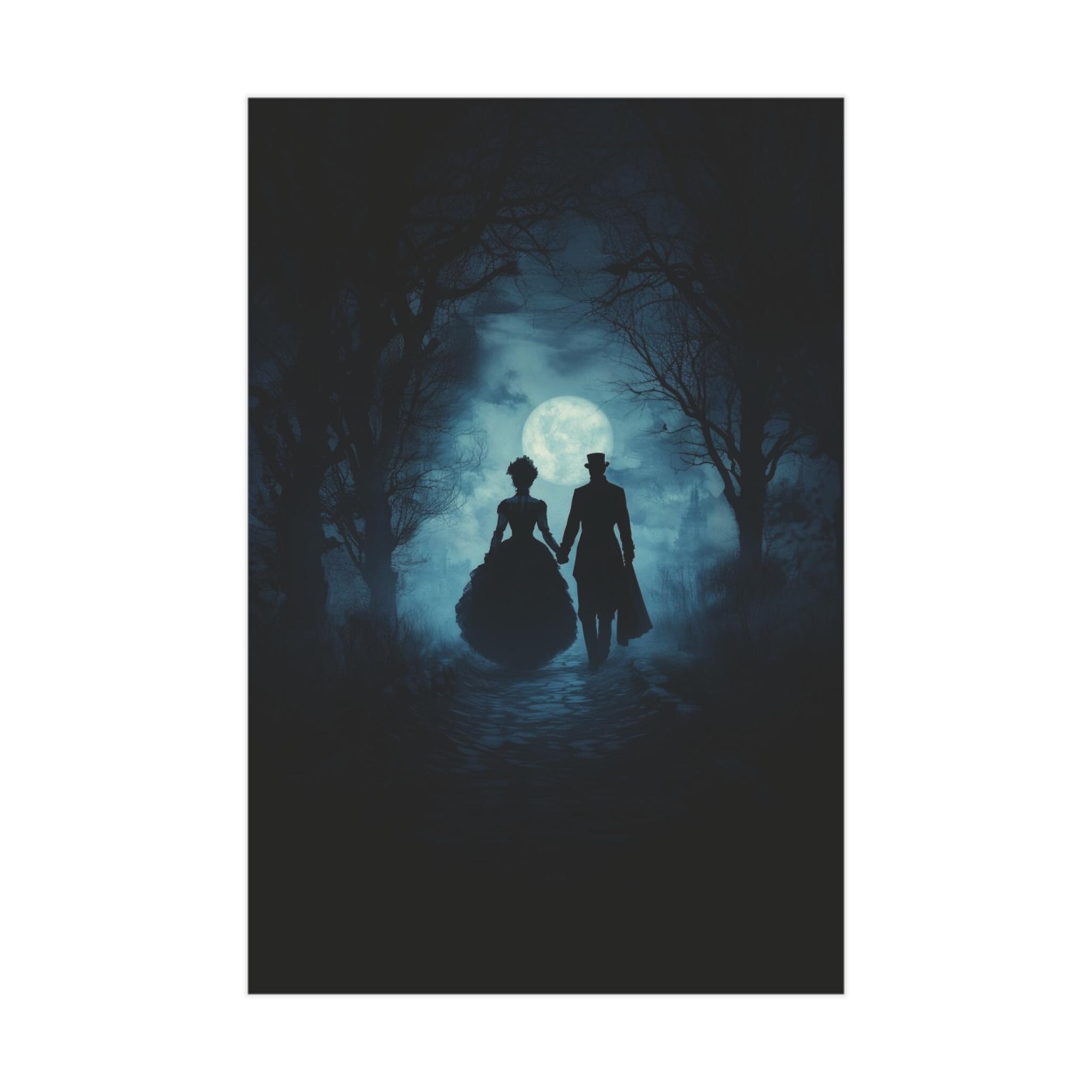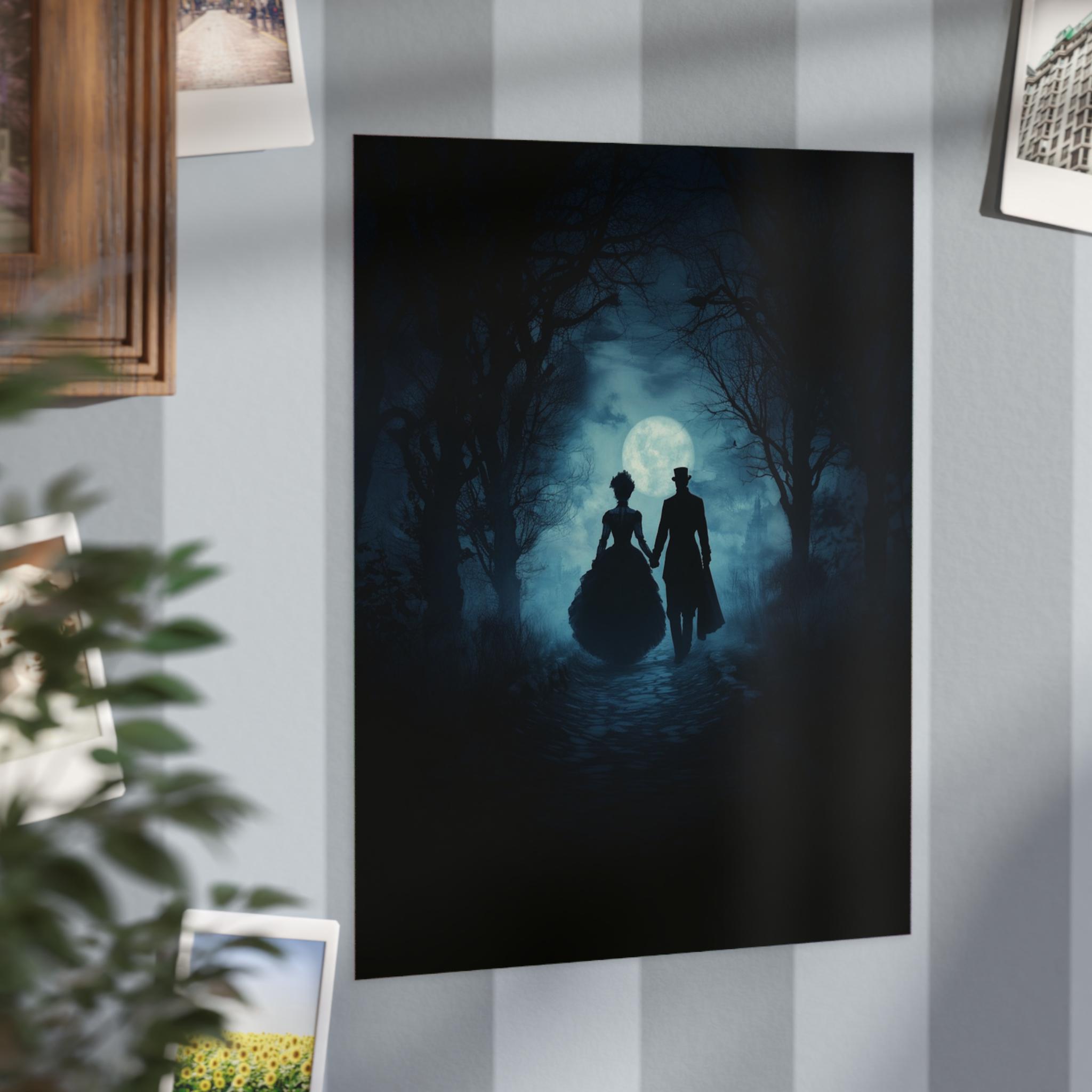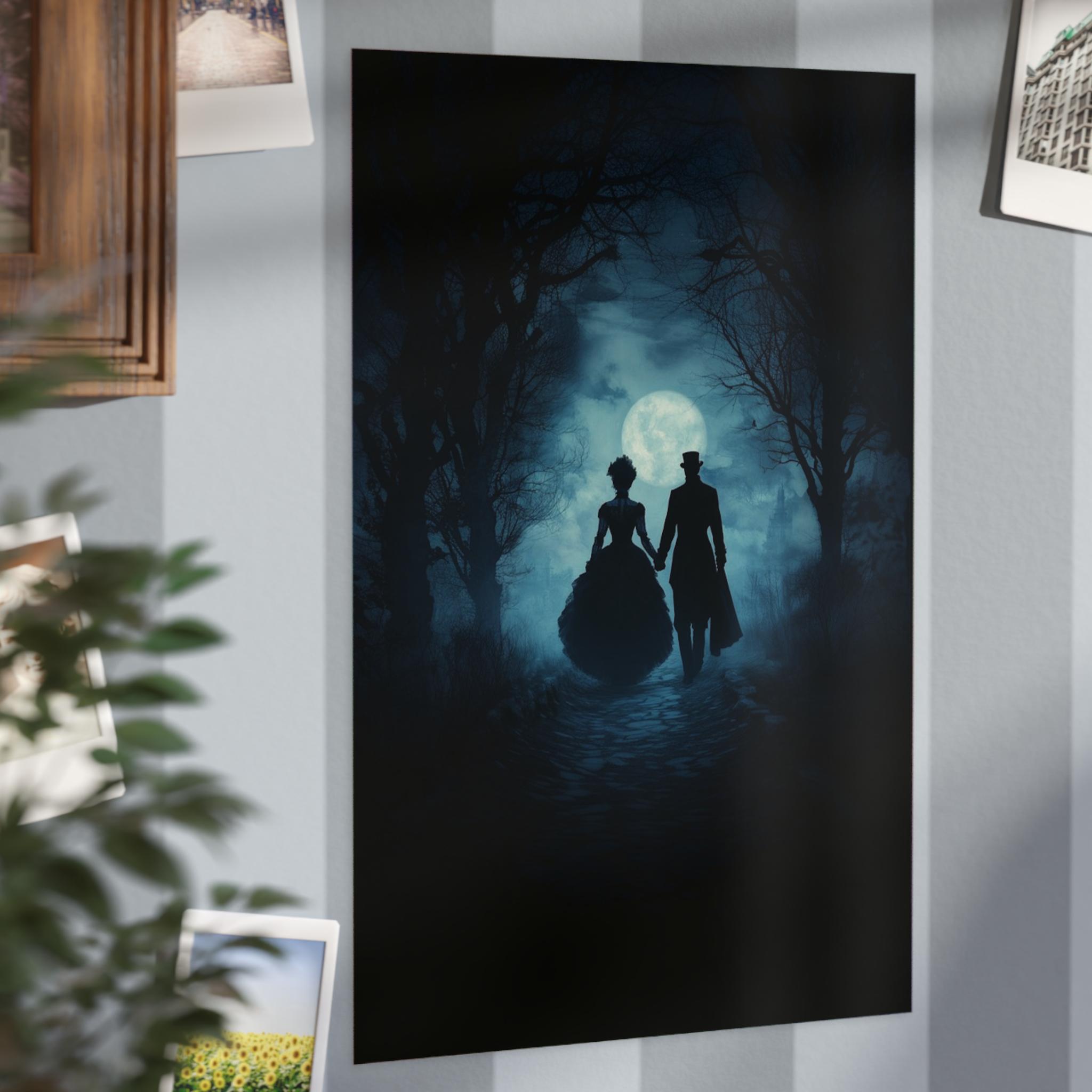 This vibrant print features a gothic couple strolling under the moonlight, adding a touch of mystery and romance to your space. Perfect for fans of gothic and romantic aesthetics, these prints are ideal for decorating bedrooms, living rooms, or any space that needs a touch of intrigue and beauty. Great for Halloween, Valentine's Day, or any occasion where a touch of mystery is desired.